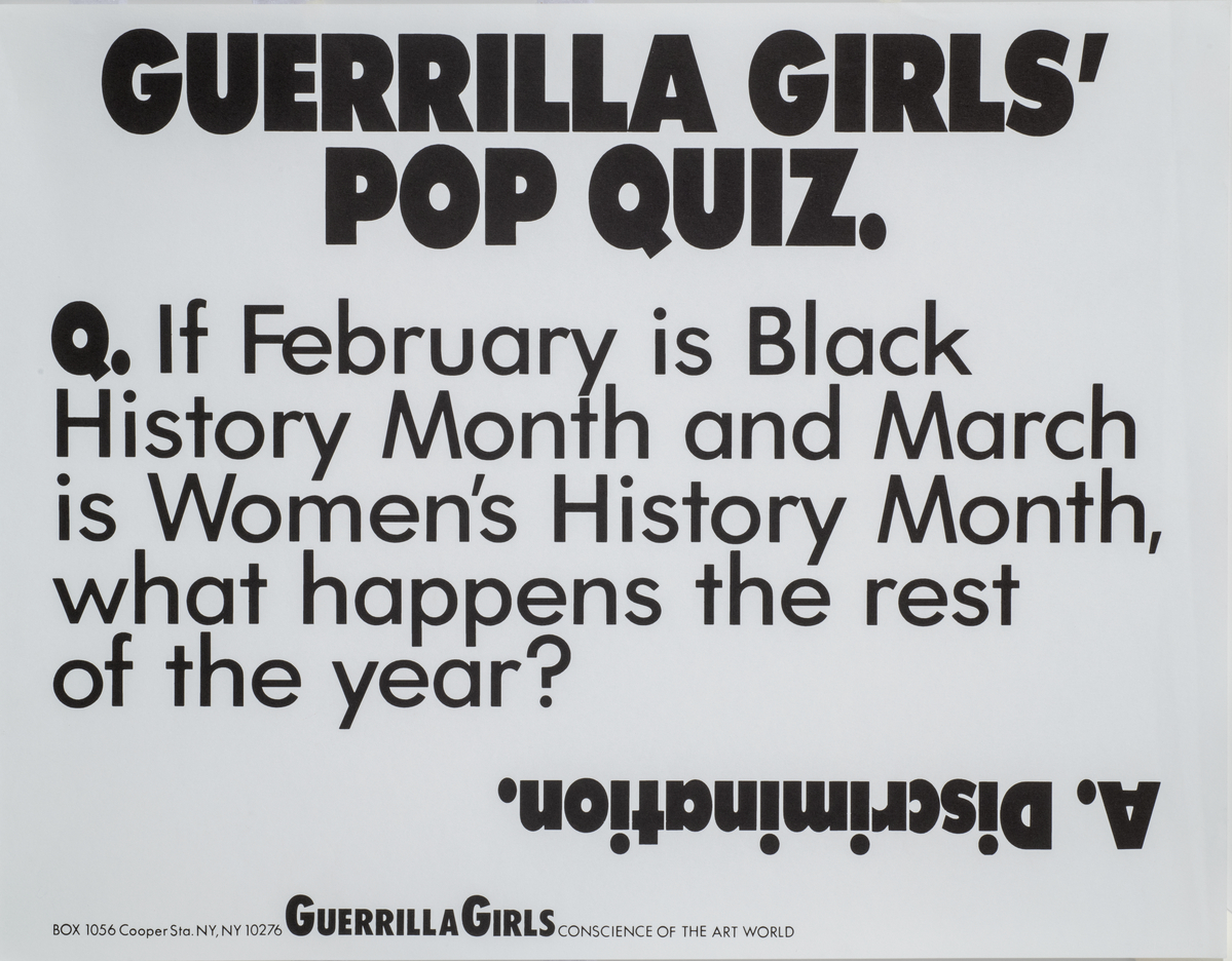 The pieces aren’t arranged in a strict timeline. Because many people are familiar with the Guerrilla Girls’ work and their story and history, “I didn’t necessarily feel like viewers would need a step-by-step chronology,” Shambroom told me. “I was really thinking about looking at some of their work from the 80s and 90s side-by-side with more recent works and seeing how many of the themes have overlapped or evolved over the years.”