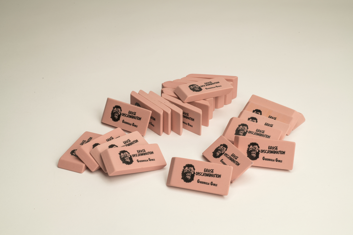 Making Trouble shows off well the scalability of the Guerrilla Girls’ work, from the “Guerrilla Girls ManifestA: For Art Museums Everywhere,” which is blown up to the size of a billboard on one gallery wall, down to the few inches of an eraser cheekily stamped “Erase Discrimination” in a glass display case.