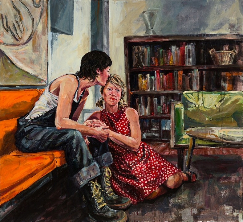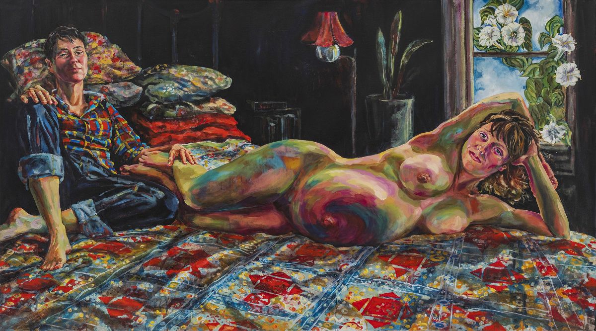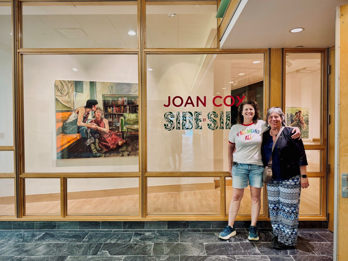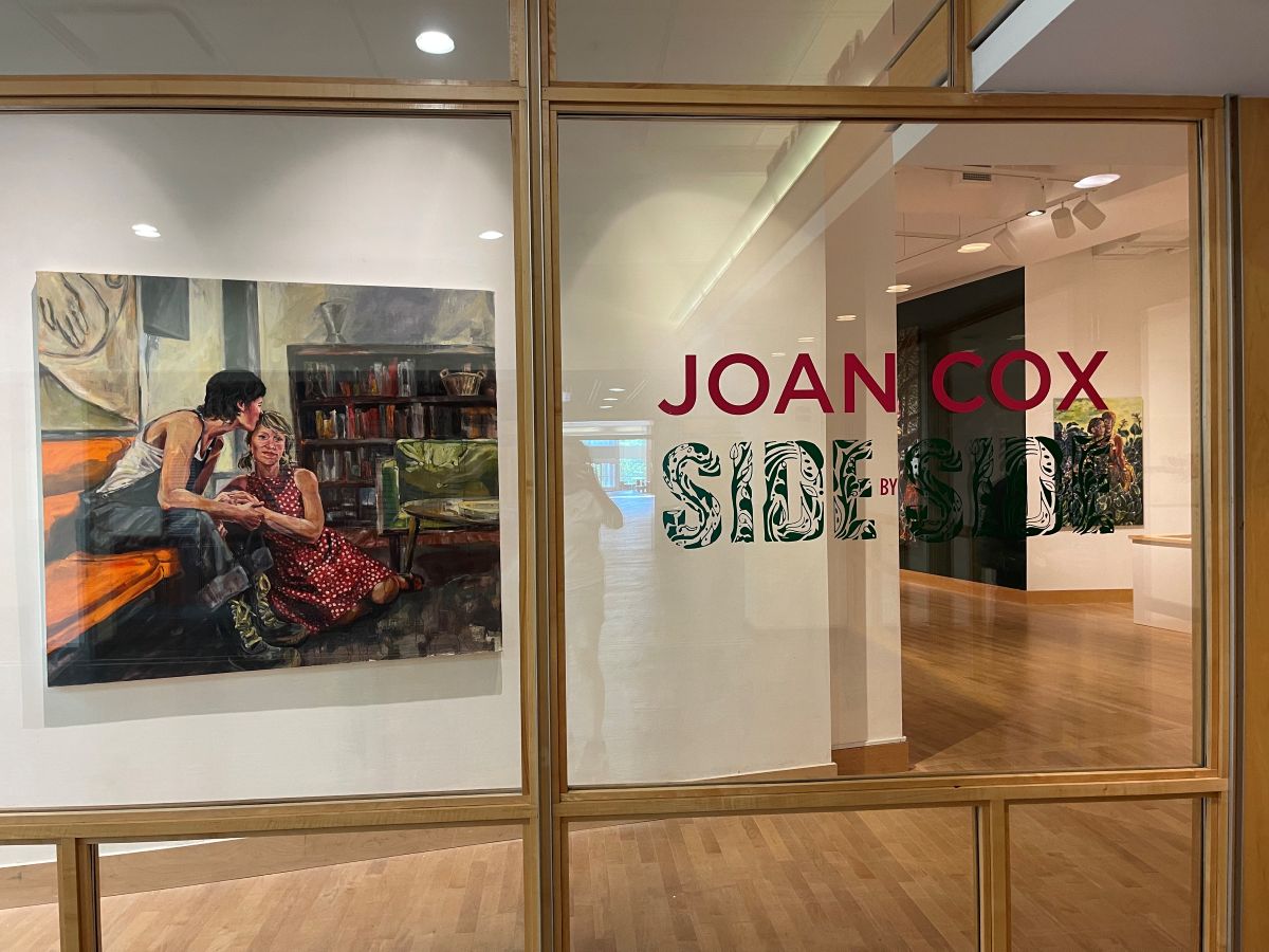 A well-known Baltimore area artist, Joan Cox has been painting for over twenty-five years, concentrating on the human figure, specifically queer portraiture. Side by Side, her latest exhibition at Towson University’s Center for the Arts gallery, explores intimate relationships between women and takes its title from a poem of the same name by Adrienne Rich (1929-2012) which describes a tender moment between lovers: “Ho! in the dawn / how light we are lie / stirring faintly as laundry / left all night on the lines.”