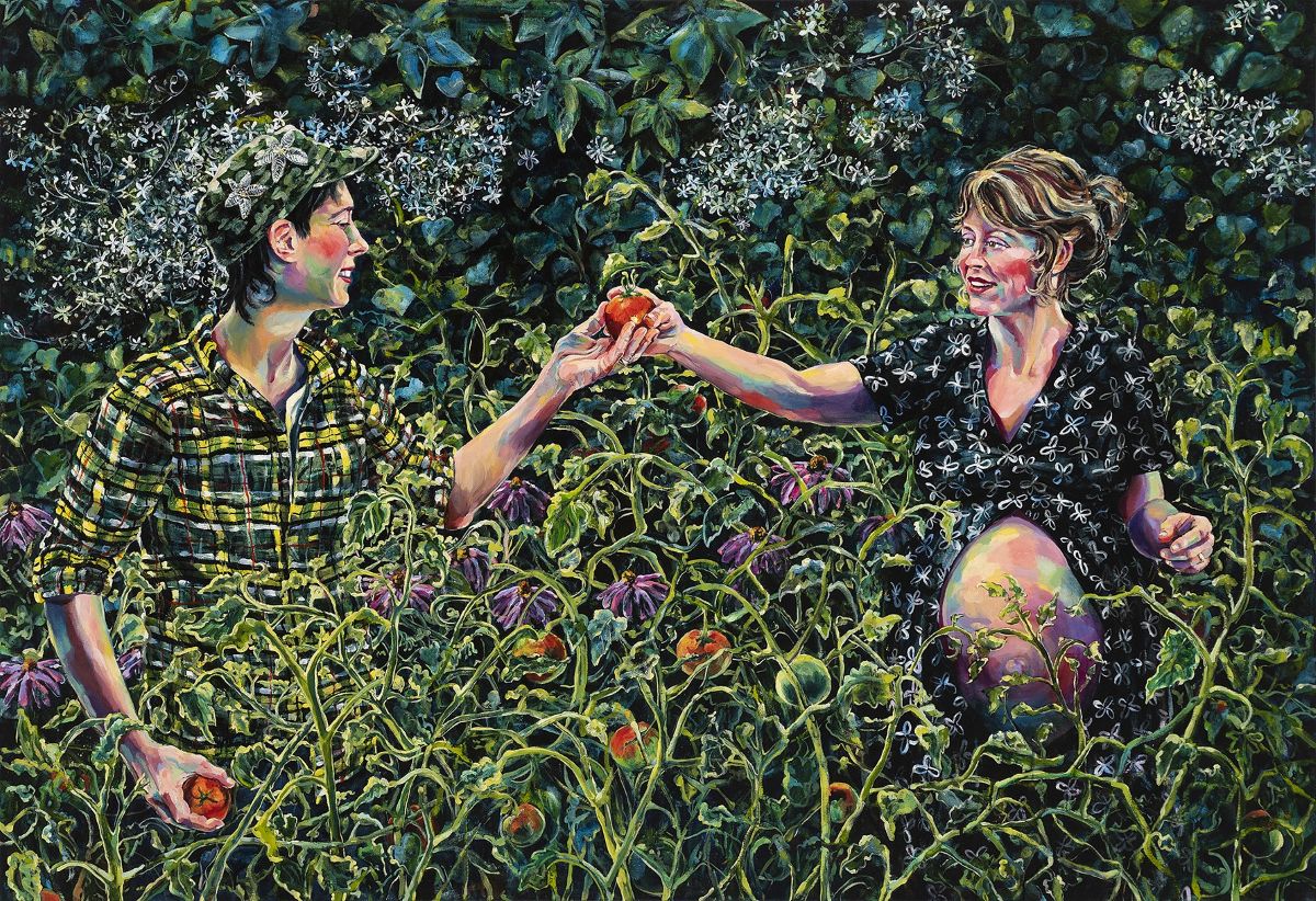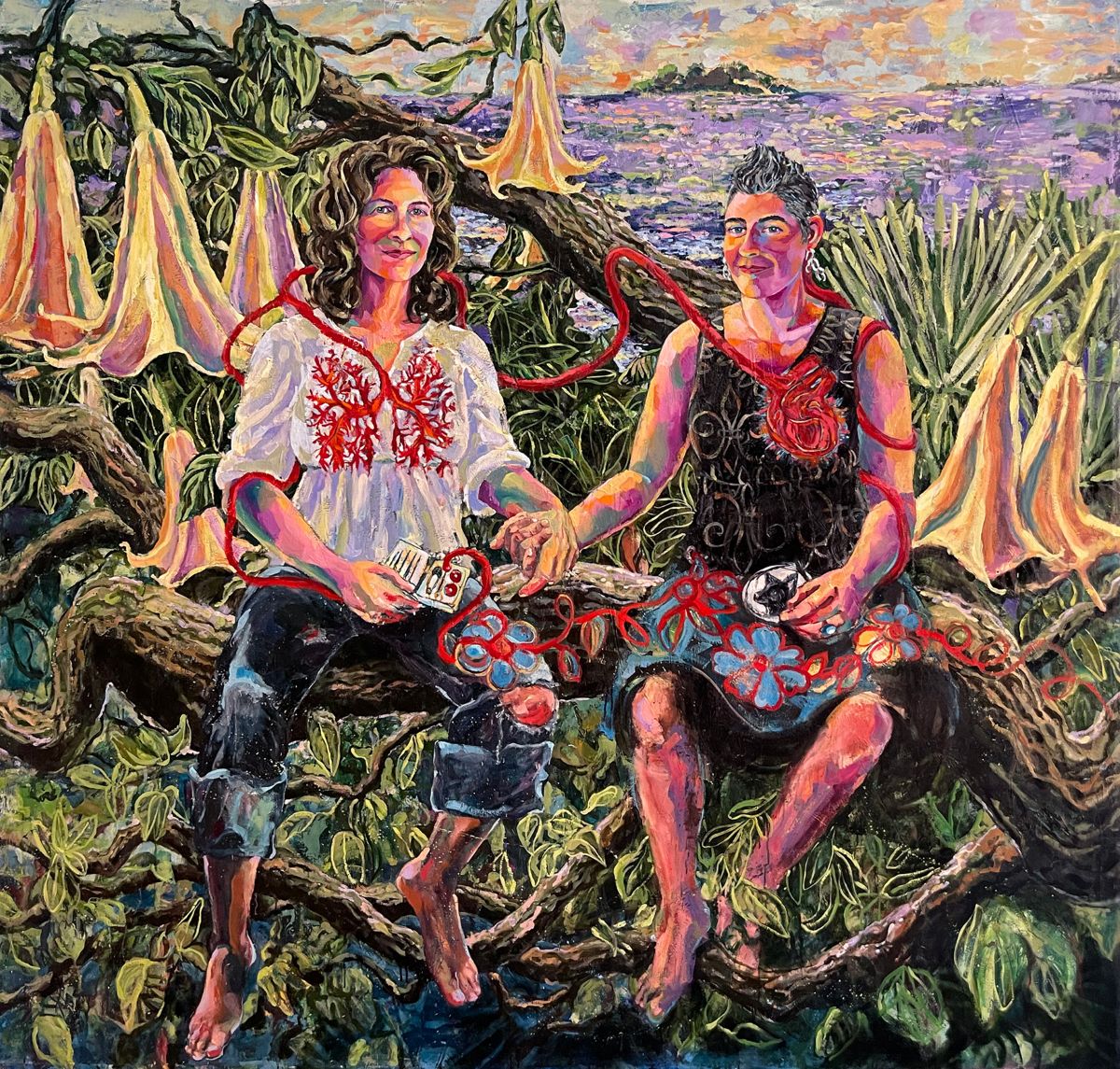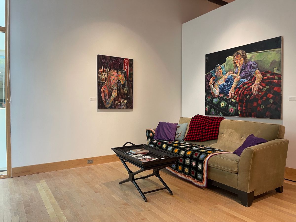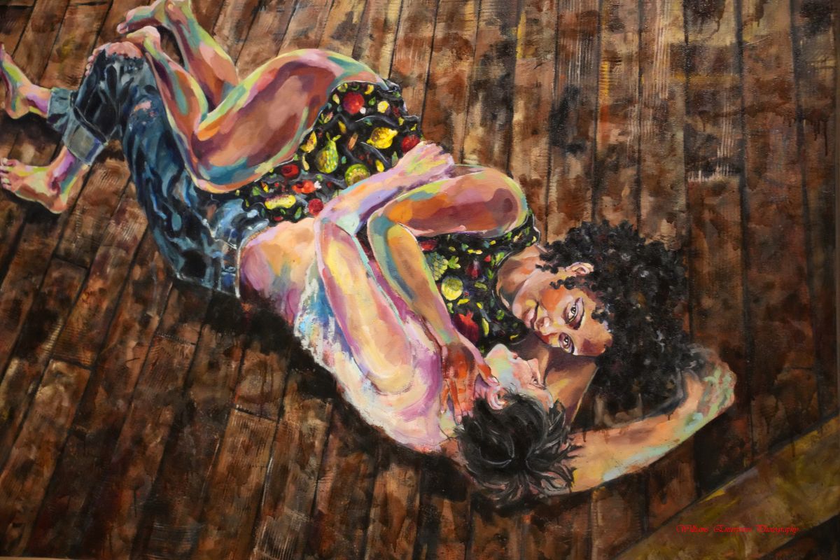 A well-known Baltimore area artist, Joan Cox has been painting for over twenty-five years, concentrating on the human figure, specifically queer portraiture. Side by Side, her latest exhibition at Towson University’s Center for the Arts gallery, explores intimate relationships between women and takes its title from a poem of the same name by Adrienne Rich (1929-2012) which describes a tender moment between lovers: “Ho! in the dawn / how light we are lie / stirring faintly as laundry / left all night on the lines.”