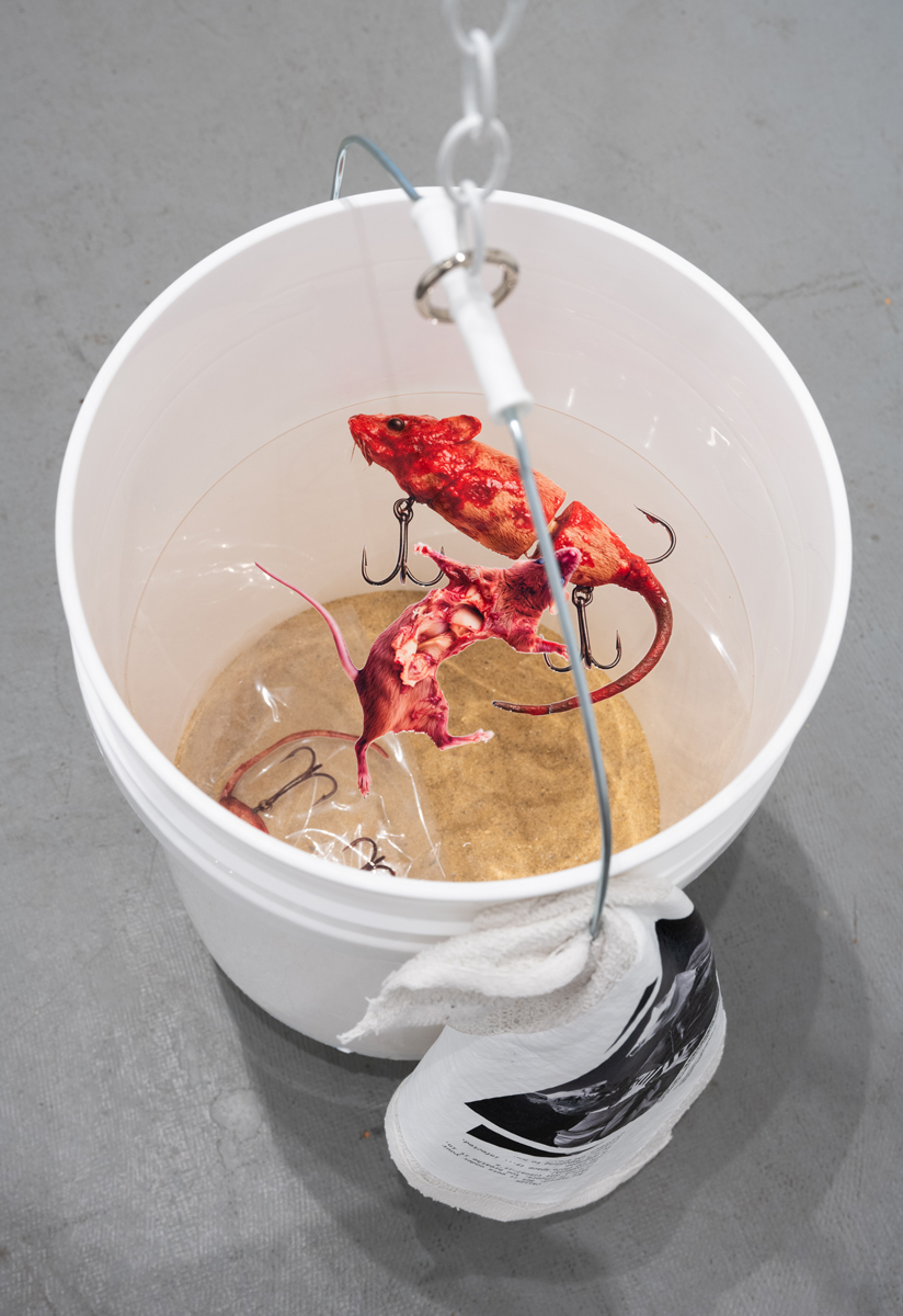 American Pest makes no sense to my logical brain. I’m annoyed by this red, white, and blue art that surrounds and enfolds me, these flattened rats in buckets and Topo Chico bottles and crushed beer cans, these artists who clearly know what they’re doing and what they’re saying, but within a code I cannot completely crack. Or, their ideas simply are too complicated for words.
