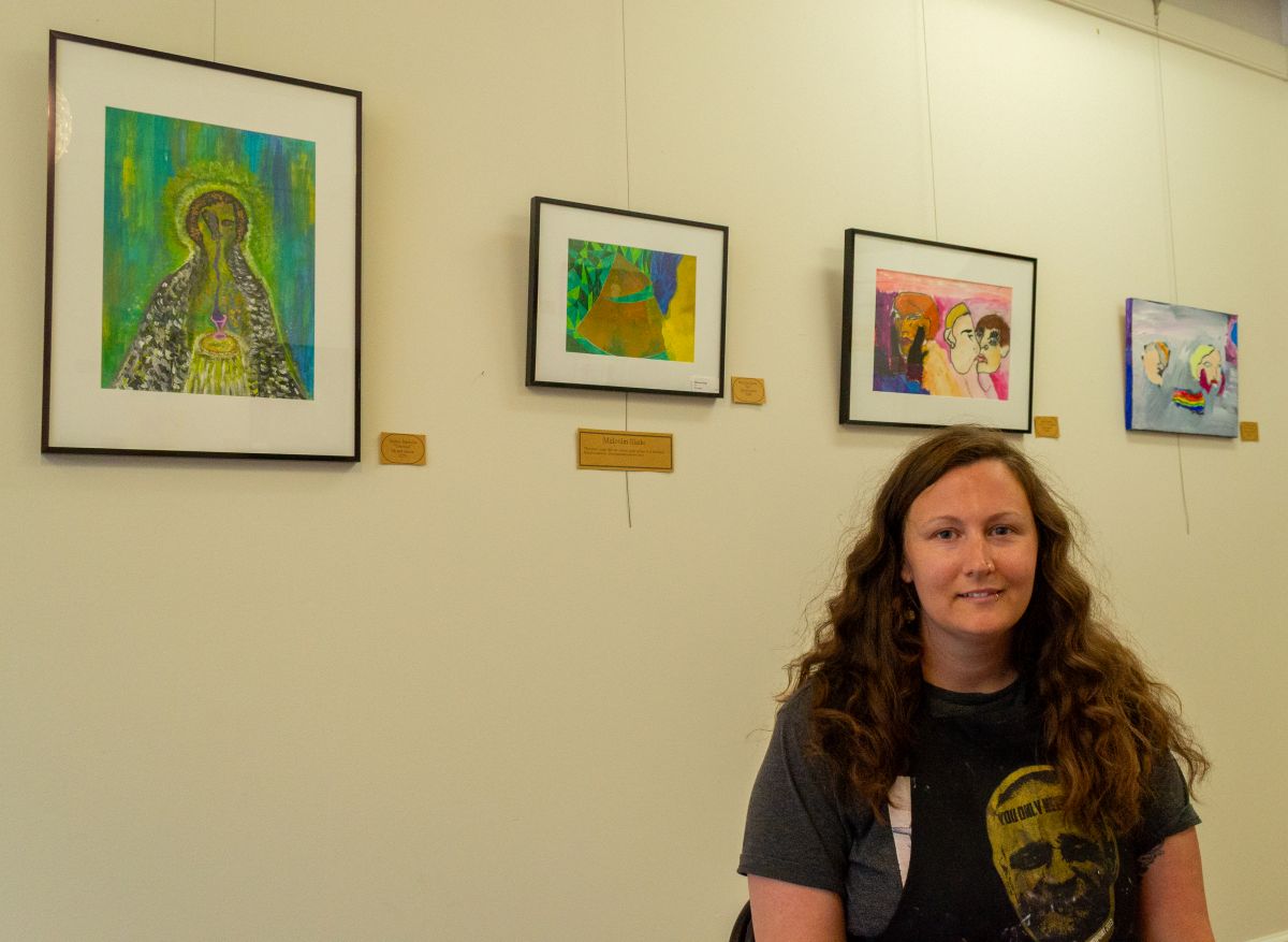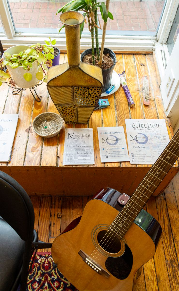 Some regulars at Moonlight made music before ever making art. Every Wednesday, they come for the jam sessions, and then they stay to display their pieces on the gallery wall. Amanda Lvnar, Moonlight’s owner, points to a painting made by a flamenco guitarist and tells me, “She goes music to art. Villager does it the other way. He goes art to music.”
