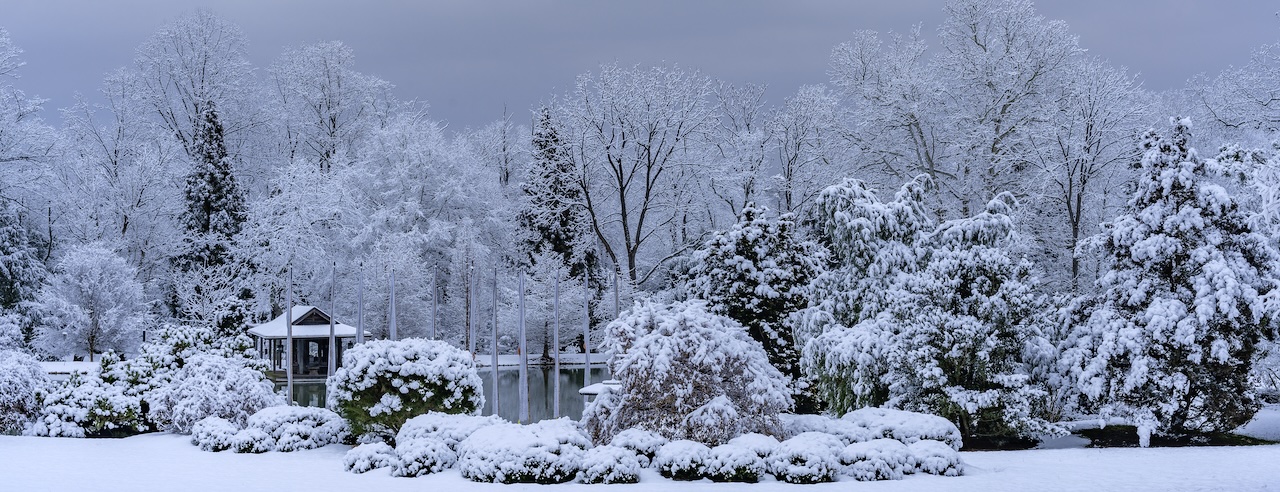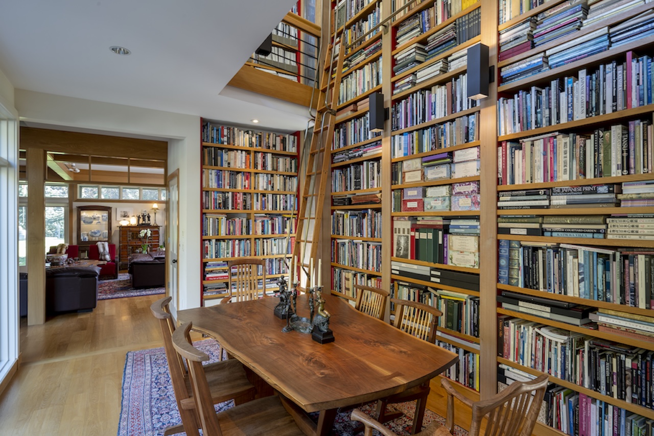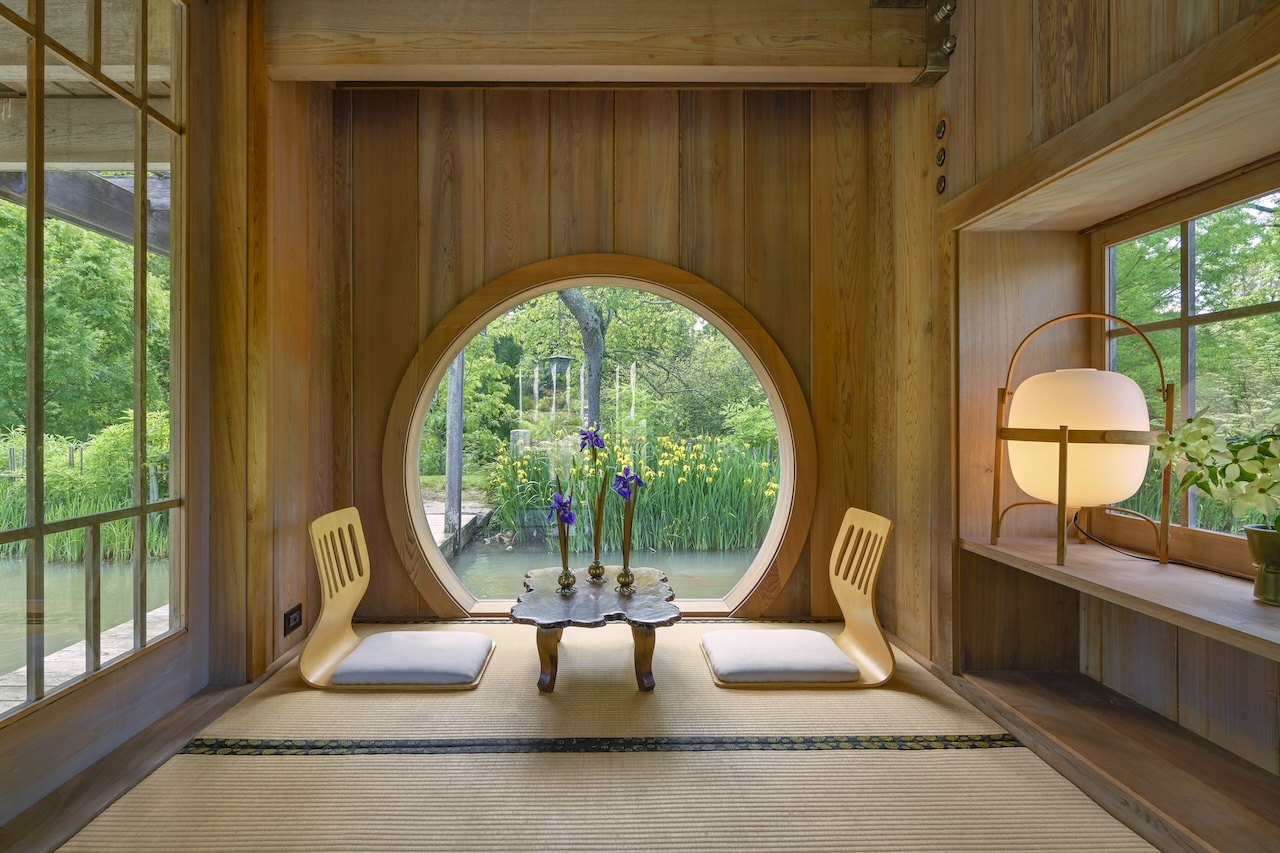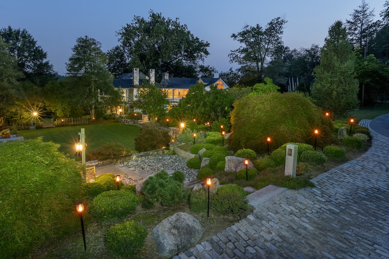 A few breezy tents frame the sidelines, guests with folding chairs and blankets dot the lawn, the archers in traditional Bhutanese garb shoot arrows at a target under the gaze of the stone figures. Parking the car nearer to the old stone farmhouse, the landscape bursts with every shade of green. Two life-sized bronze giraffes tower overhead, encircled by a grove of native walnut and mulberry trees. Rows of Himalayan Buddhist prayer flags wave casually in the breeze, printed with text to reinforce their message. Dozens of antique granite Japanese lanterns and pagodas punctuate the vast property, but the focal point is the stone and glass house located high up on the hill which faces a small lake.