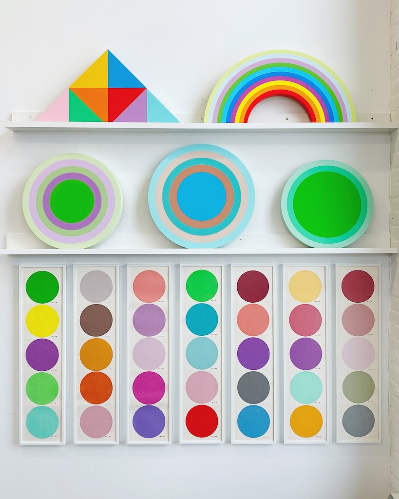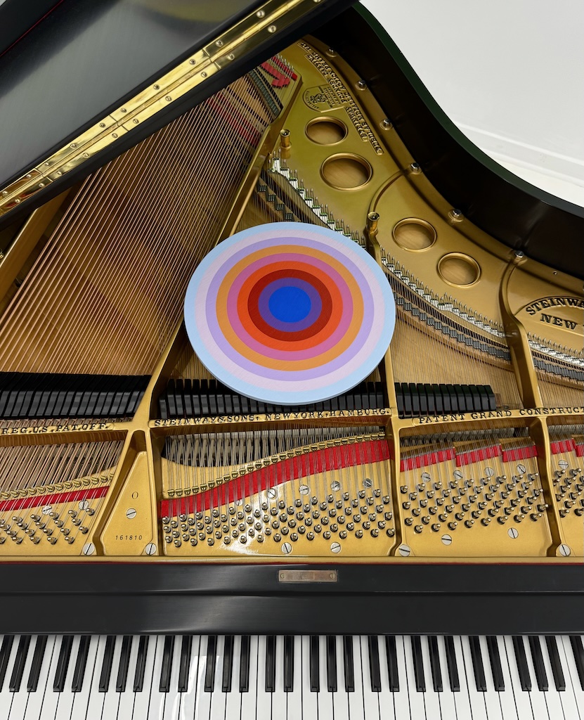 The new paintings, like all the works in the series, are tondos rendered in perfectly even and uniform layers of acrylic. Few or even dozens of concentric circles, varying sometimes subtly and sometimes dramatically in chromatic gradation, radiate outward from or converge inward toward a perfectly even and uniform monochrome center. They seem to shimmer and undulate, these circles, like ripples from a single stone dropped into still water. Deepening in their own cumulative resonance even as they fade, one into the next, these are echoes of sounds, thoughts, visions, dreams, memories.