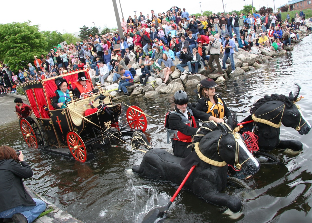 There were only six vehicles taking part in the first race. “That first year, they looked like trash on wheels,” Segreti laughs. The all-terrain race had to travel on pavement, through mud and across water, so they launched the kinetic sculptures into the Inner Harbor. Simultaneously, there was a yacht race happening as part of the Waterfront Festival.