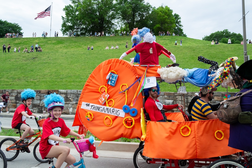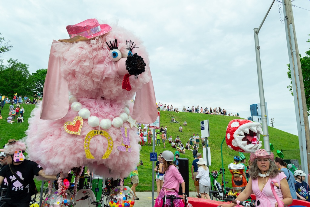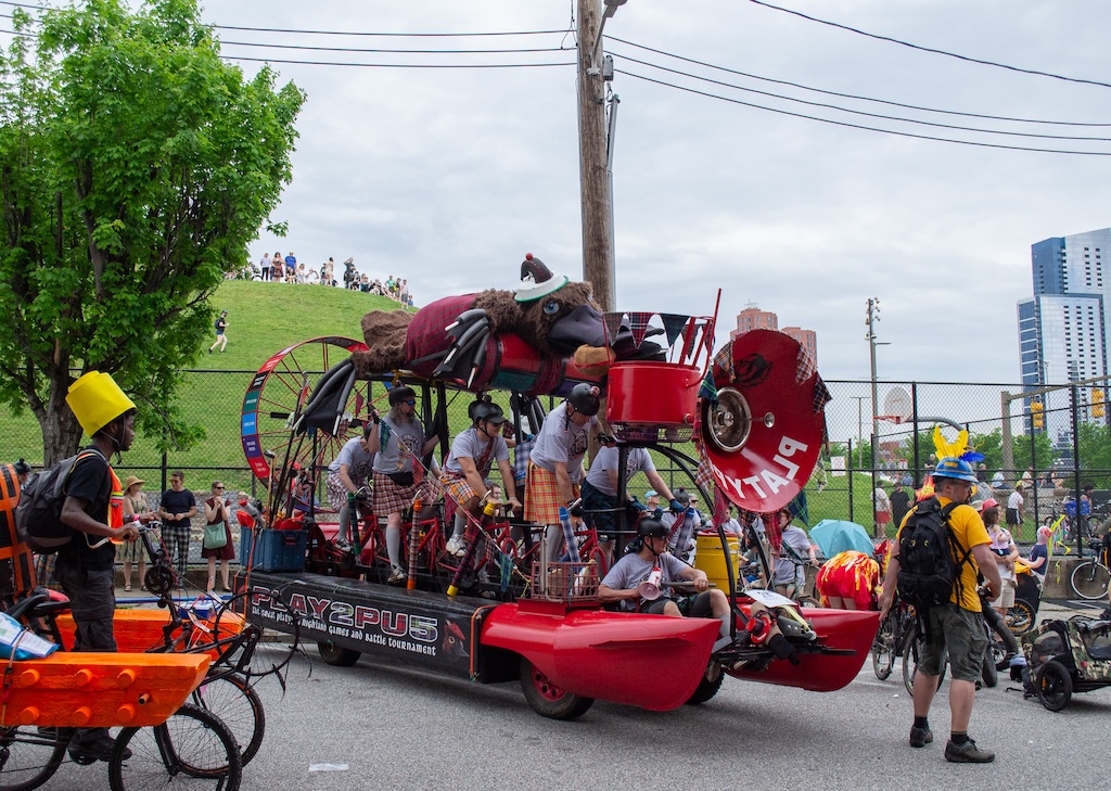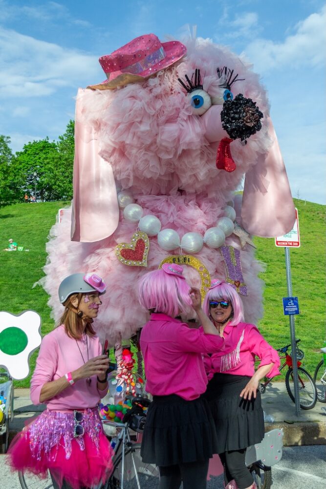 The PLATYPUS is a well-documented vehicle in the Kinetic Sculpture Race archive. There’s also Fifi, a 15’ pink poodle made by Segreti. One year there was a kraken made out of upcycled water bottles and a cardboard bear dressed up as the Statue of Liberty. When it comes to making an entry, the possibilities are infinite. Perhaps this is what makes the whole thing such an ongoing attraction. Although there is an extensive rule guide and plenty of parameters to work with, there is also a lot of room for exploration. “It underscores the importance of play, but also that intuitive know-how, to figure things out,” says Rebecca Hoffberger, AVAM’s Founder and former Director. “It’s done in such a safe environment, it’s not cut-throat competition, it’s the joy of a community coming together and putting on this moveable feast for the eyes.”