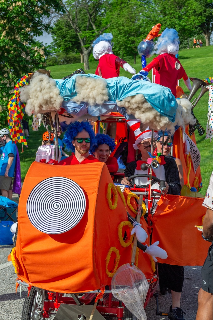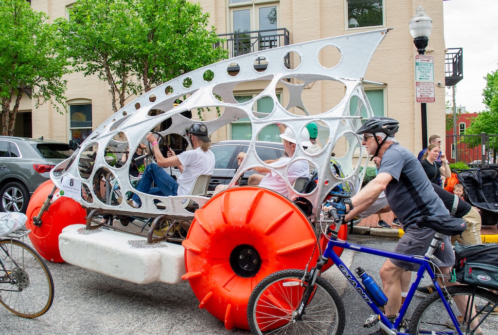 Metal artist David Hess has a lot of experience with traveling through the race course. After designing AVAM’s central staircase, he was recruited to join the first race and has been a Kinetinaut ever since. The following year, his five year-old son had learned to ride a bike and wanted to be a part of his team. “Hobart Brown’s big philosophy was giving kids a sense of what adults having fun looks like,” Hess says. They became an inter-generational team when Hess’ dad joined. “It’s been a huge thing, my son has been in it many years now, he’s thirty years old. My dad has only missed one year, he just turned 88.”