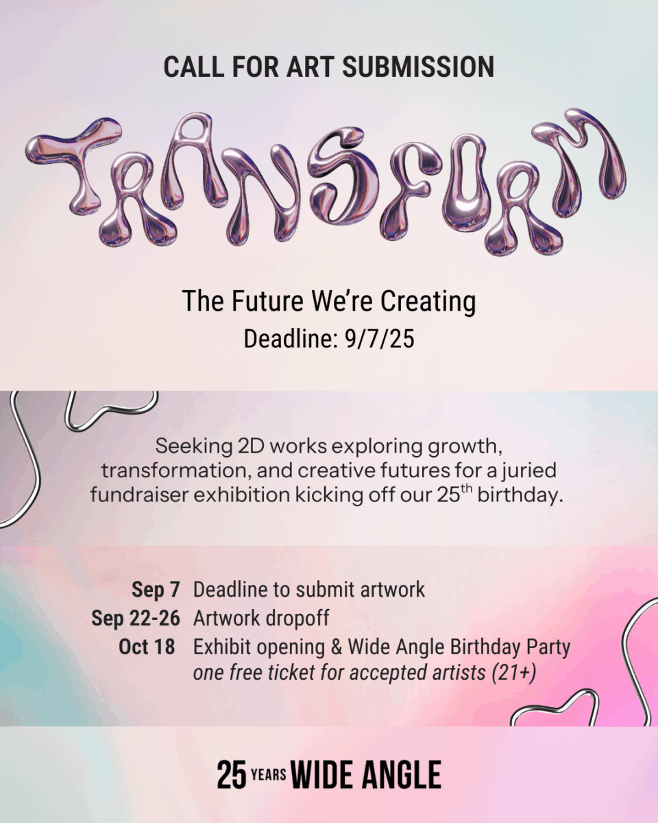 Wide Angle Youth Media is inviting local artists to submit original artwork for inclusion in our juried fundraiser exhibition kicking off our 25th Birthday Party this fall. We’ll be celebrating a quarter century of youth-driven storytelling, creativity, and community in Baltimore. We’re seeking 2D works that speak to themes of growth, transformation, and creative futures.