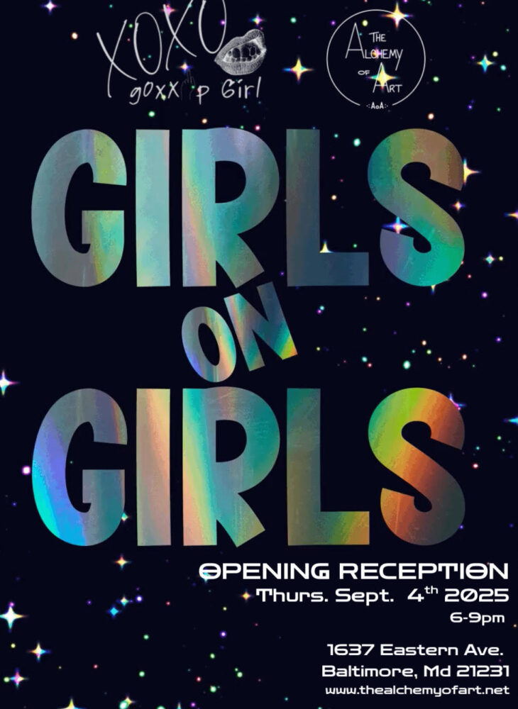 Girls on Girls is a fun and flirty exhibition celebrating the work of the Goxxip Girl Collective, an all female identifying group of artists whose work is diverse yet unified by the feminine urge to create. We invite you to participate in the female gaze by joining us for the opening reception of Girls on Girls at the Alchemy of Art on Thursday, September 4 from 6 PM to 9 PM. The Alchemy of Art is located at 1637 Eastern Ave. Baltimore, MD.