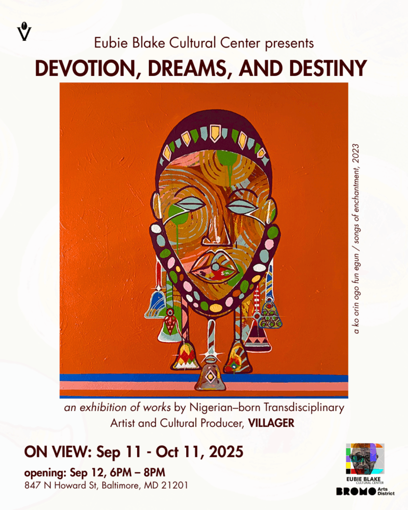 Eubie Blake Cultural Center is pleased to present Devotion, Dreams, and Destiny, a solo exhibition of works by the Nigerian–born Transdisciplinary Artist, VILLAGER (b. A. Adekunle Adaranijo) on view from September 11 to October 11, 2025. VILLAGER’s work explores the intersections of post-colonial identity, material intelligence, and ancestral/indigenous knowledge production through a spiritual, anthropological, and visual-material-based inquiry that uncovers and interprets the sublime, intangible forces shaping the evolution of culture, identity, and consciousness.