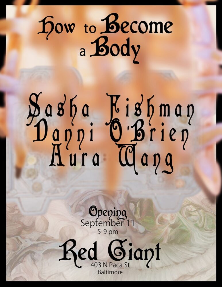 How to Become a Body opens with a public reception on September 11 from 5-9pm. The exhibition is on view through October 25, 2025 at Red Giant located at 403 N. Paca Street in Baltimore, MD, 21211.  How to Become a Body features works by three Baltimore-affiliated artists; Sasha Fishman, Danni O’Brien, and Aura Wang.