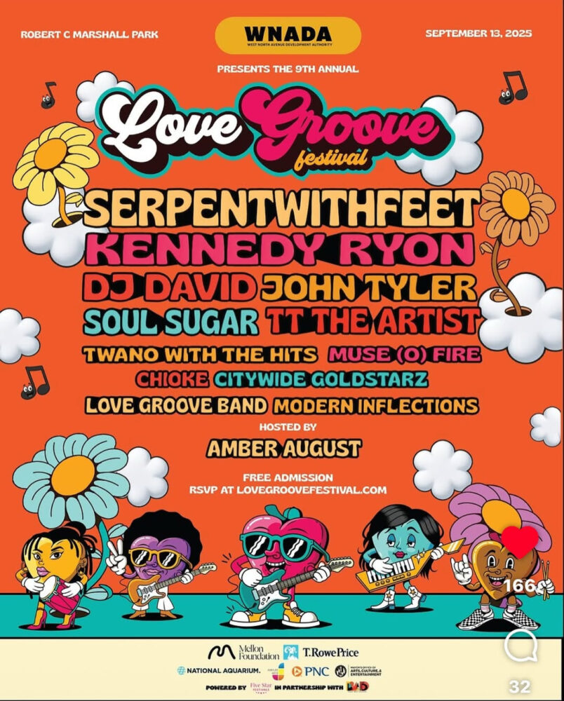 August 21, 2025- Whether you like live music, local art, dancing, yoga, shopping, family activities or want to participate in a community run or bike ride, there is something for everyone at the 9th Annual Love Groove Festival, taking place on Saturday, September 13 from 12-8 p.m. at the Robert C. Marshall Park, 1211 Pennsylvania Ave., Baltimore, MD 21217. Founded by young entrepreneur, Emmy-award winning film composer and visionary John Tyler, this FREE, family-friendly festival features live music, a pop-up art gallery, live painting, an artists & makers market, over 60 vendor and nonprofit tents, local food and drinks, family-friendly activities and a petting zoo.  This year, they have added a 1.5-mile community run, a bike ride and party as well as a group yoga class that will kick off the main event. All events are free, but registration is encouraged. For more information, visit https://lovegroovefestival.com.