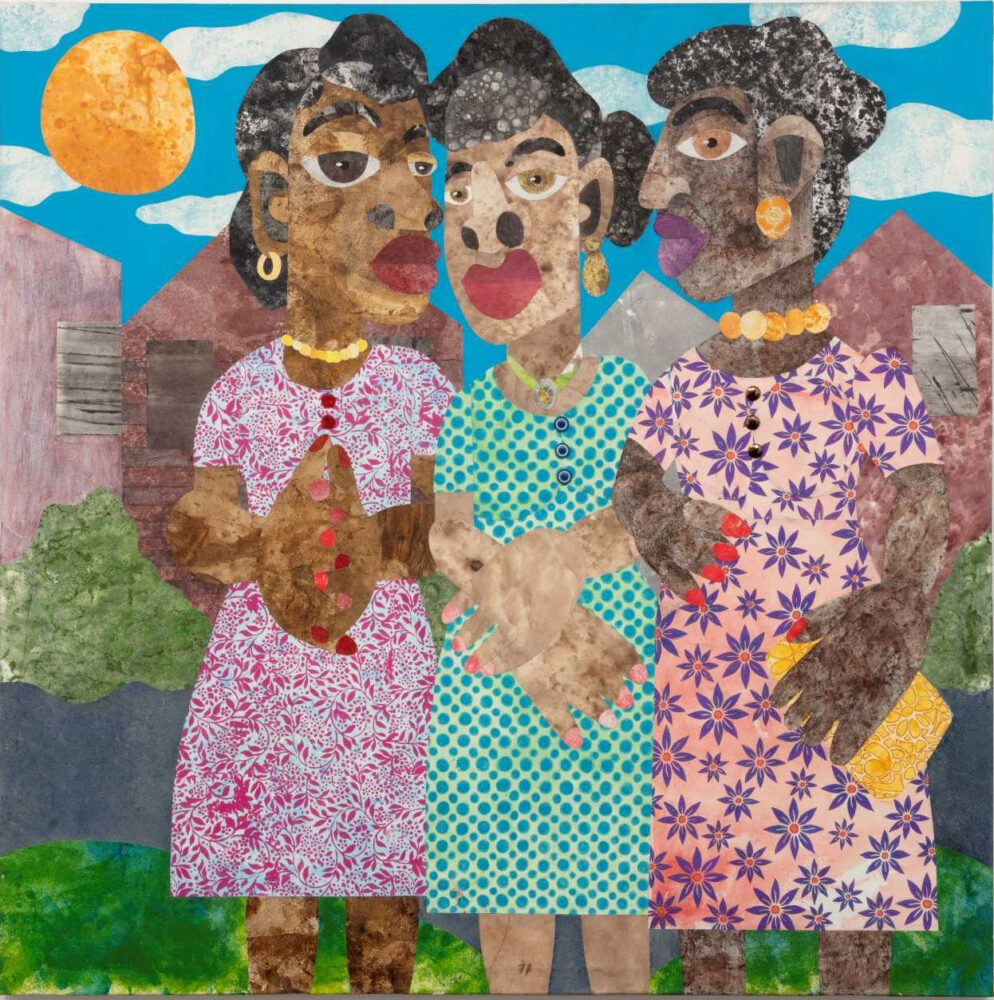 Image Credit: Evita Tezeno, True Sistahs, 2024 (detail). Acrylic, mixed-media collage, and buttons on canvas, 48 x 48 in. Courtesy of the artist and Luis De Jesus Los Angeles.
