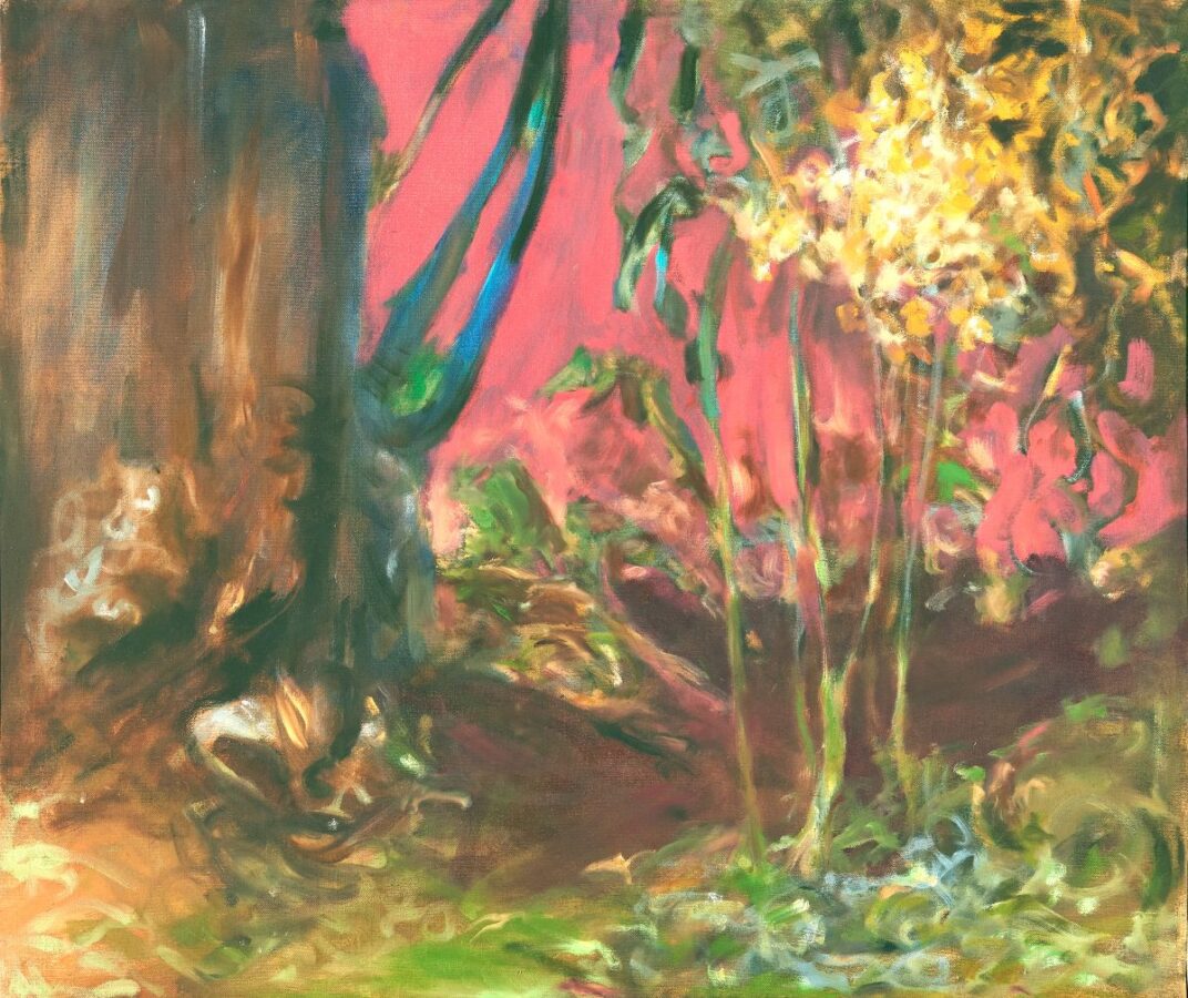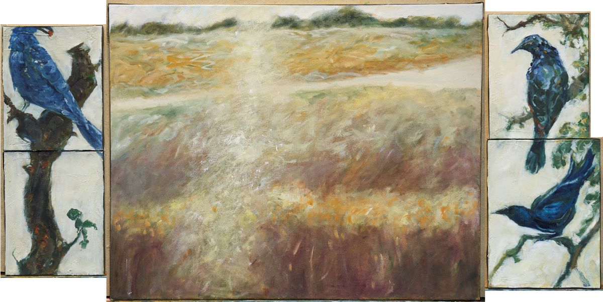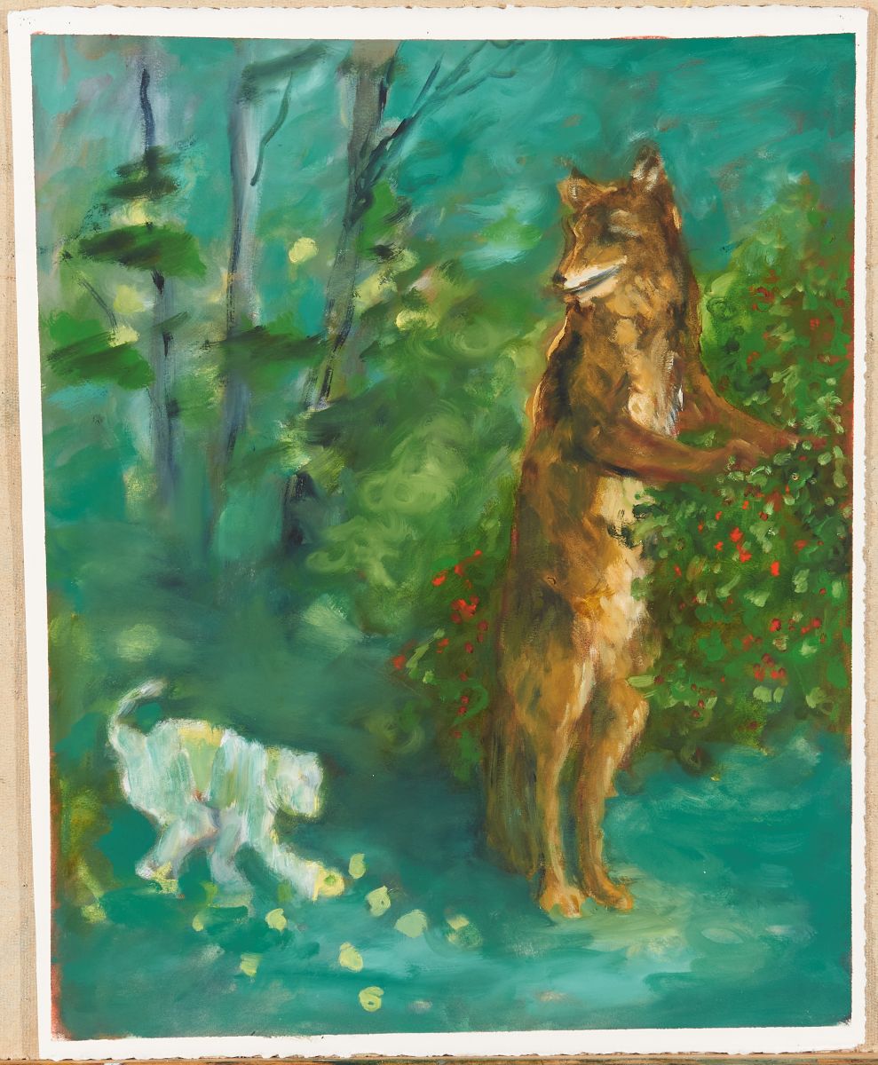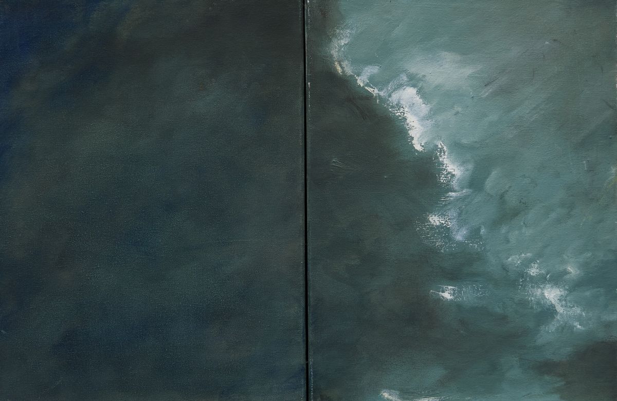 Just as many contemporary young artists refuse to be confined to a single “style” and challenge labels, English blends various painting and drawing styles and formats. Some paintings are pure abstraction, while others are imagist or animal/figurative—often blurred into a slurry of bliss. The sea and landscape mentioned in the text appear and fade in the paintings, conveying mysterious emotion beyond words.
