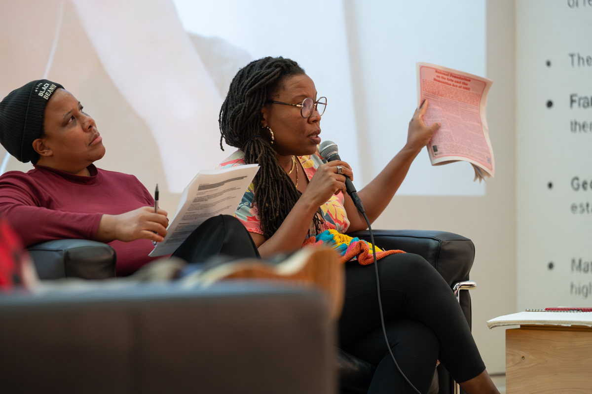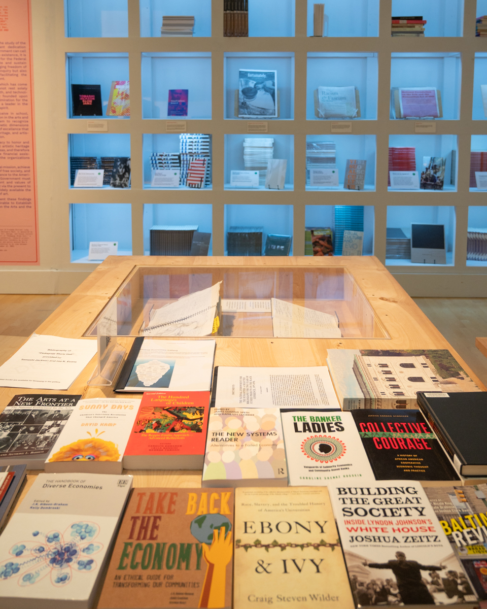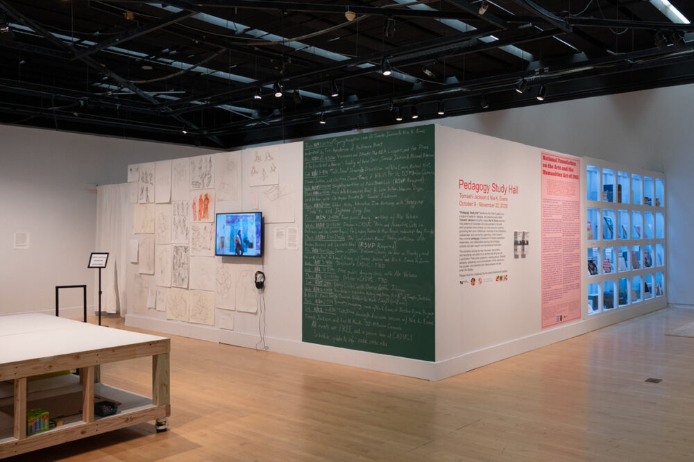 Pedagogy Study Hall provides public access to many of these histories. Gallery visitors can read legislation that affected arts, humanities, and education in a hand-drawn timeline that will accrue data points over the run of the exhibition. They can learn about local histories through video interviews with Baltimore-based cultural leaders. Individuals are also invited to shape history as active participants by engaging in reading discussions, arts workshops, and other educational offerings in community with others.