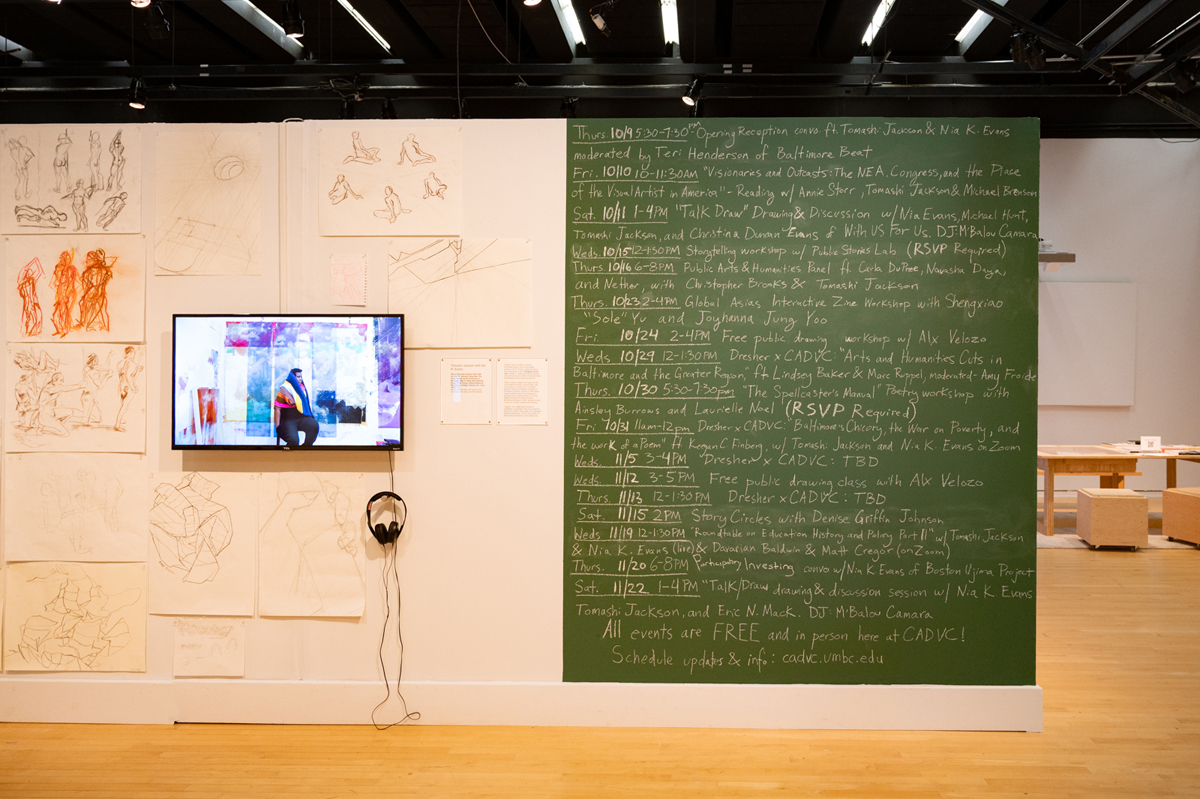 “UMBC allowed me to come here when all of this was a knot of emotion,” Jackson shared with me in an interview. “What was really keeping me up at night, this knot in my chest, was the long-term implications of an absence of shared history for visual artists who rely upon the humanities to pass it on. If we don’t give it away, we don’t get to keep it. We get to keep it because we give it away.” This shared history has been negatively impacted or even purposefully eradicated by continual disinvestments in the arts and humanities in schools and at local, state, and federal levels.