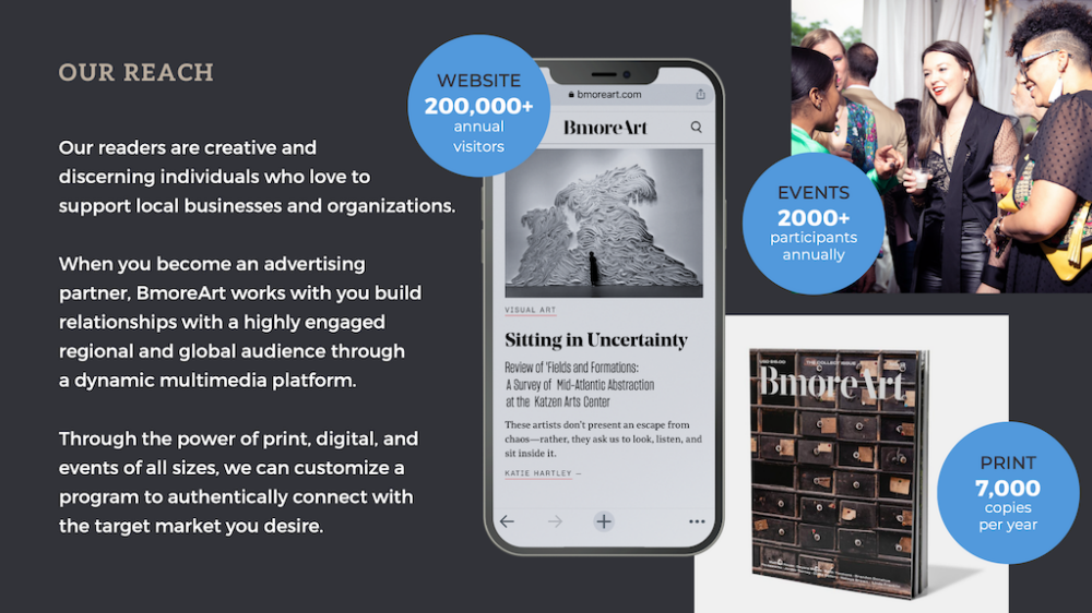 BmoreArt’s readers are creative professionals, art students, artists, makers, curators, collectors, and arts administrators. Email our Aya Dixon, Coordinator of Media Partnerships, for our most recent Media Kit.