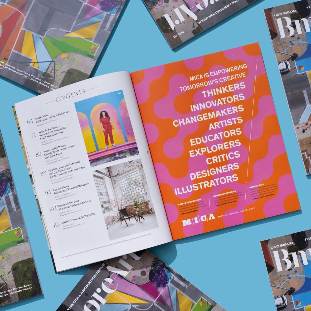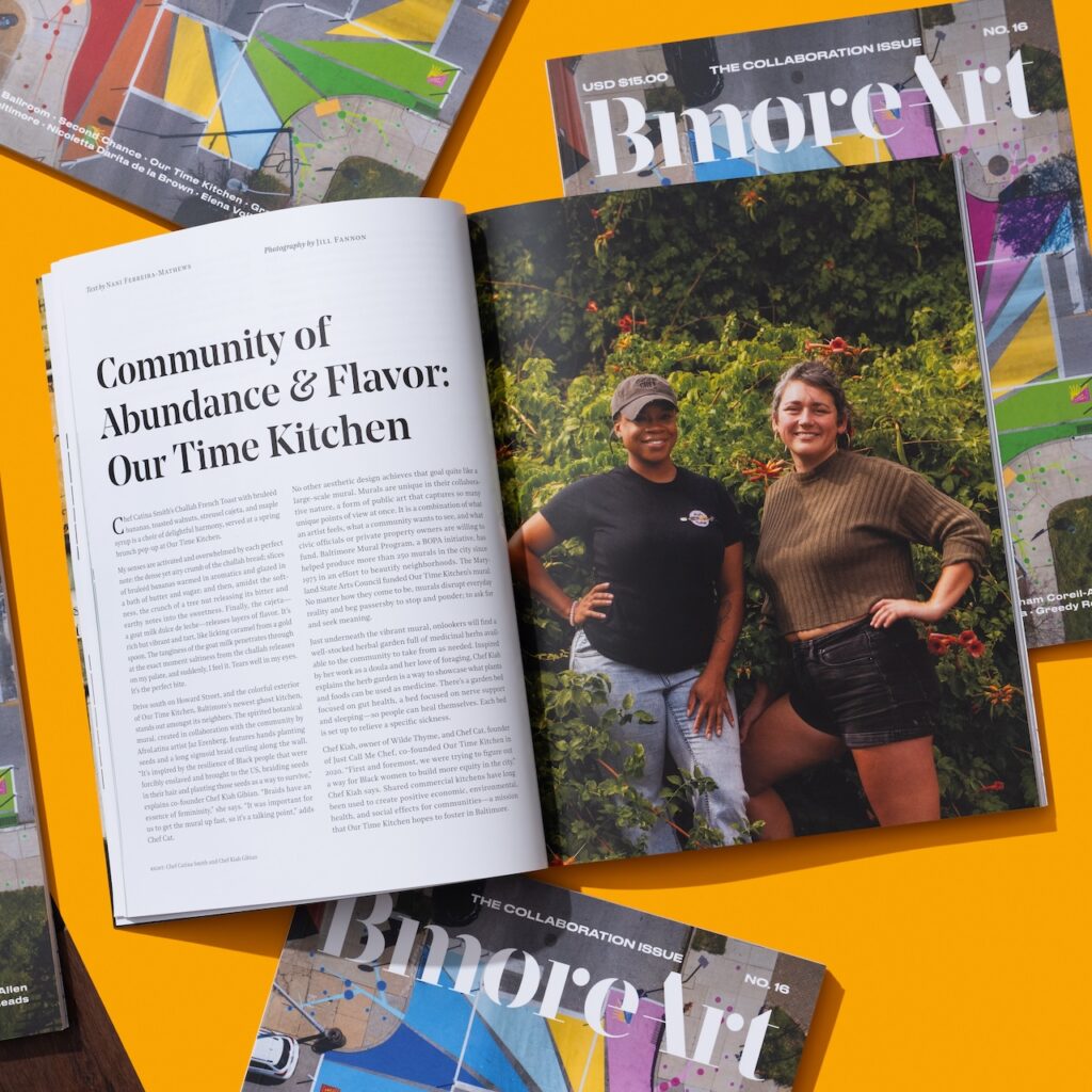 This issue includes Our Time Kitchen, Graham Projects, Mobtown Ballroom, JHU Sheridan Libraries Artist-in-Residence Nicoletta Daríta de la Brown, Greedy Reads sell-out Water Taxi cruises; Second Chance’s mission to uplift individuals as well as historic things; Elena Volkova’s portrait series, the Baltimore Met Gala, Made in Baltimore, and many other artists who place collaboration at the center of their practice.