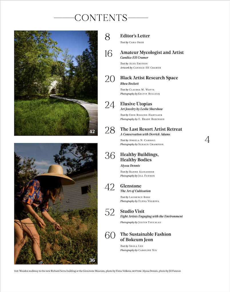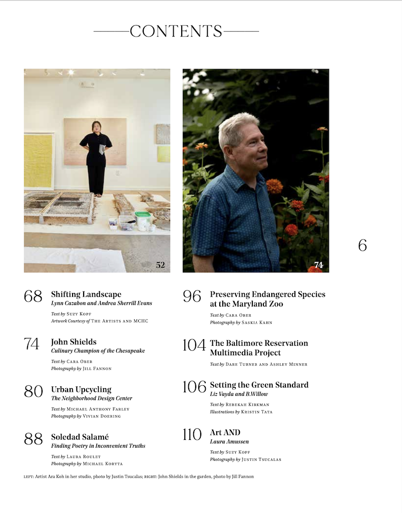 Issue 14 considers our shared environment as a source of inspiration for artists, a community supporting social practice, and an opportunity for meaningful engagement in the world. Featured artists include Soledad Salamé, Rhea Beckett, Alyssa Dennis, John Shields, Bokeum Jeon, as well as the Maryland Zoo, Last Resort Space, Glenstone Museum, and The Neighborhood Design Center.